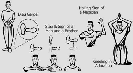 The People make several gestures throughout the ceremony. Near the very beginning is the Step and Sign of a Man and a Brother, which was the original (now obsolete) Step and Sign of the I° of O.T.O., which signifies our Birth as incarnate beings. On four occasions the People give the Hailing Sign, which was the original sign of the II°, the degree symbolizing Life. When the People stand, the proper stance is the Dieu Garde. Finally, there is brief Kneeling in Adoration with the hands joined above the head. This gesture is not tied to any particular degree, but has other possible meanings, including the Union of Opposites, the flame of illumination, and the salutation of a Deity.